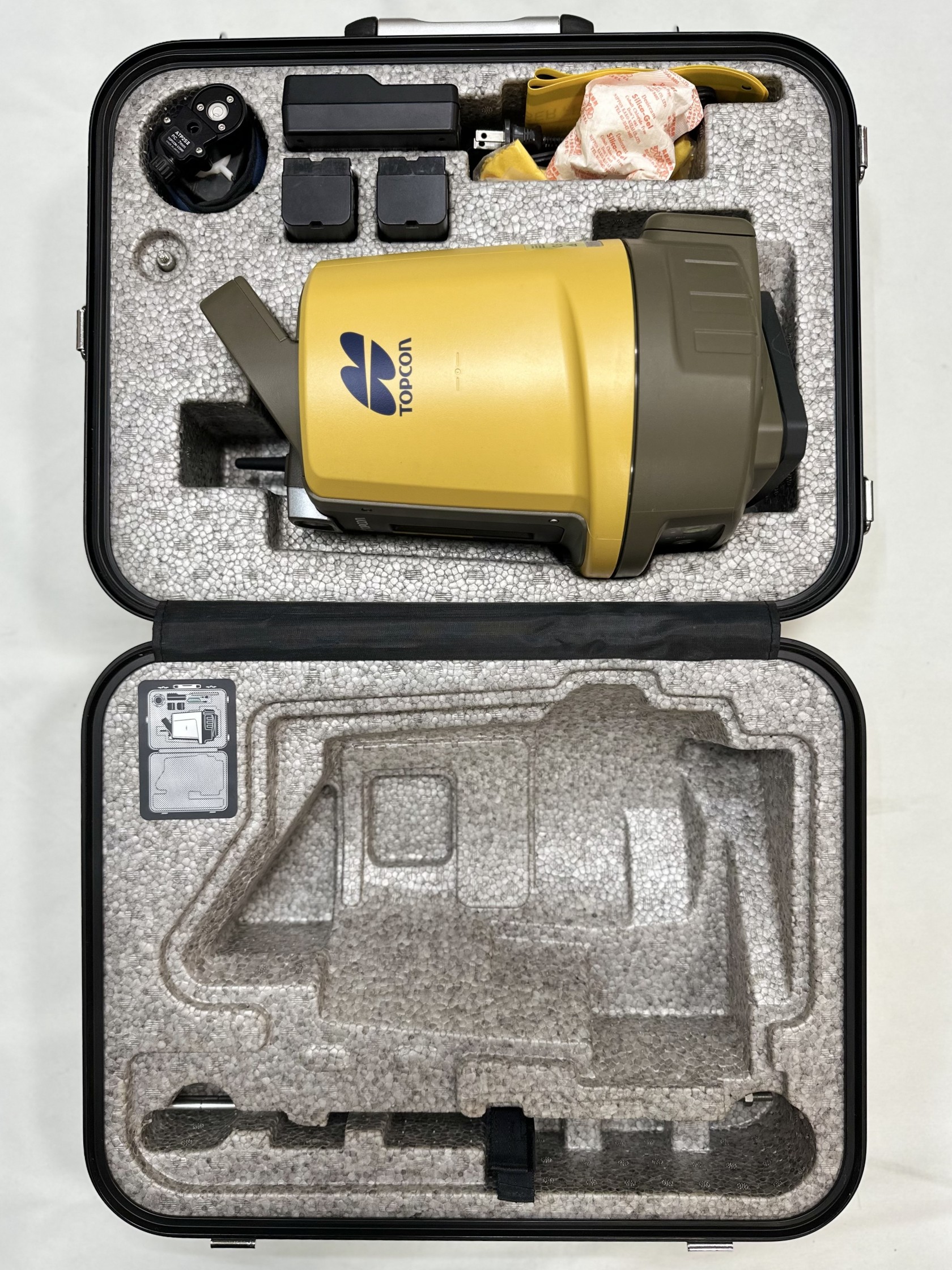 バッテリー2個、充電器、電源ケーブル、プリズム、ピンポール、石突、クロス、レーザー警告標識、取扱説明書(CD)
